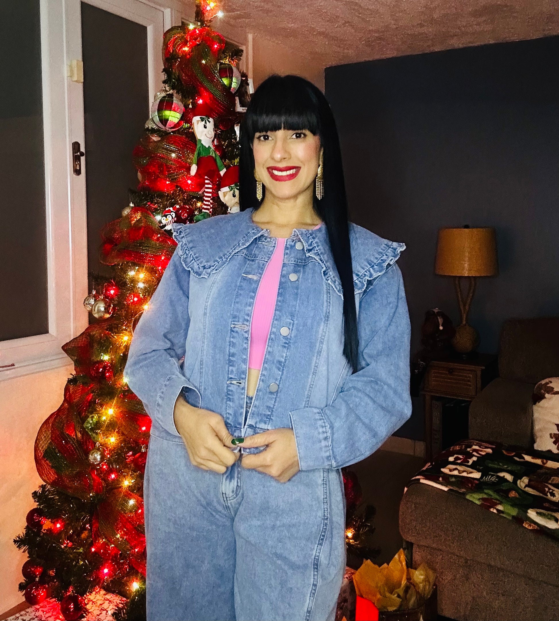 Jacket en denim color azul con diseño estructurado. Bolsillos funcionales en los laterales y por dentro; detalle de cuello con volantes en terminaciones fruncidas que añaden un toque romántico y femenino. Su corte favorecedor y versátil lo convierten en una pieza ideal para complementar vestidos, tops o looks casuales, logrando un estilo elegante y atemporal.