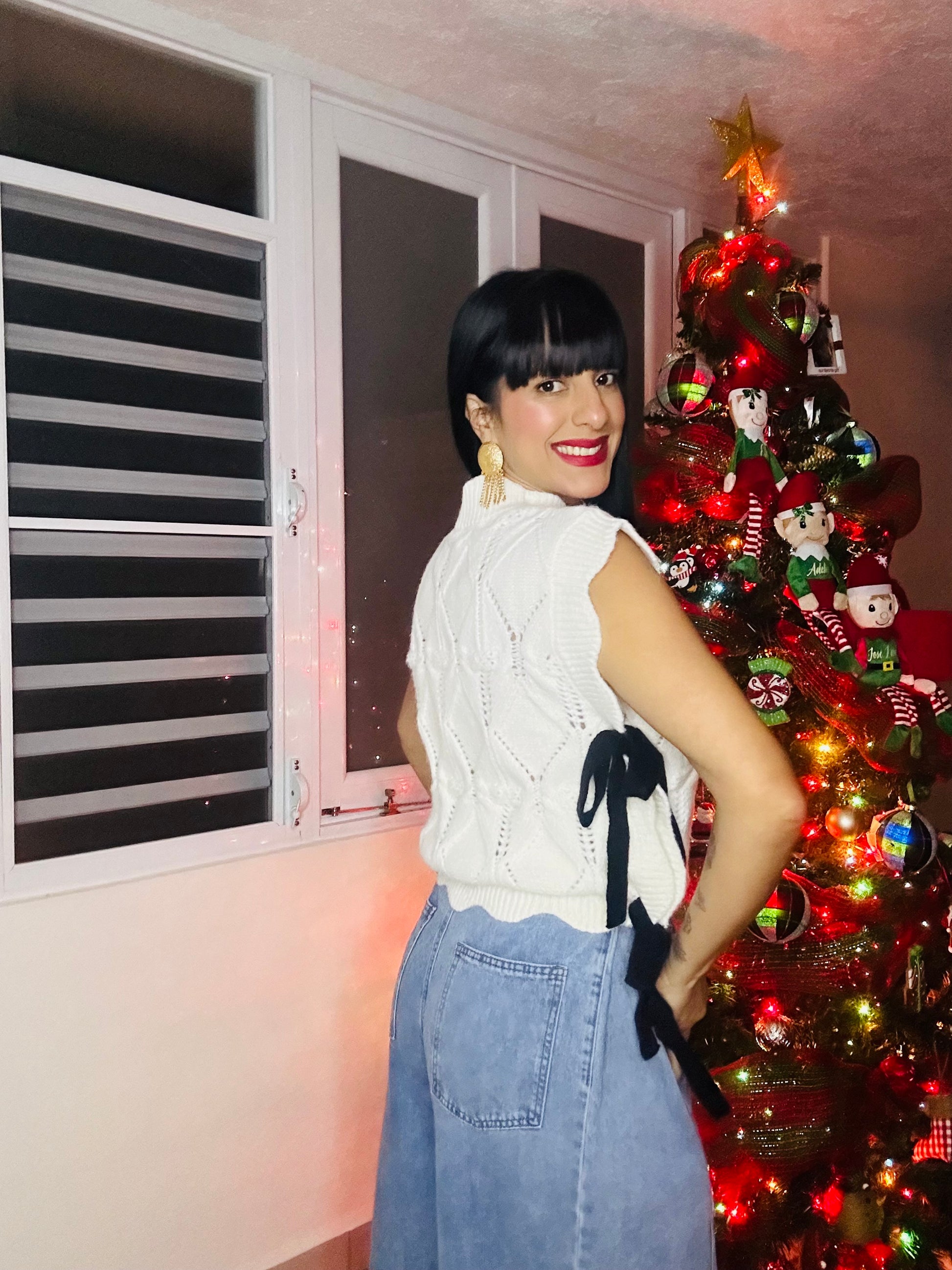 Top tejido en tono marfil con diseño calado delicado y ajuste lateral con lazos que permiten adaptarlo a tu silueta. Su textura suave y estructura ligera lo convierten en una pieza cómoda y elegante, ideal para elevar looks casuales o combinar con faldas y pantalones para un estilo femenino, moderno y con un toque chic sin esfuerzo.