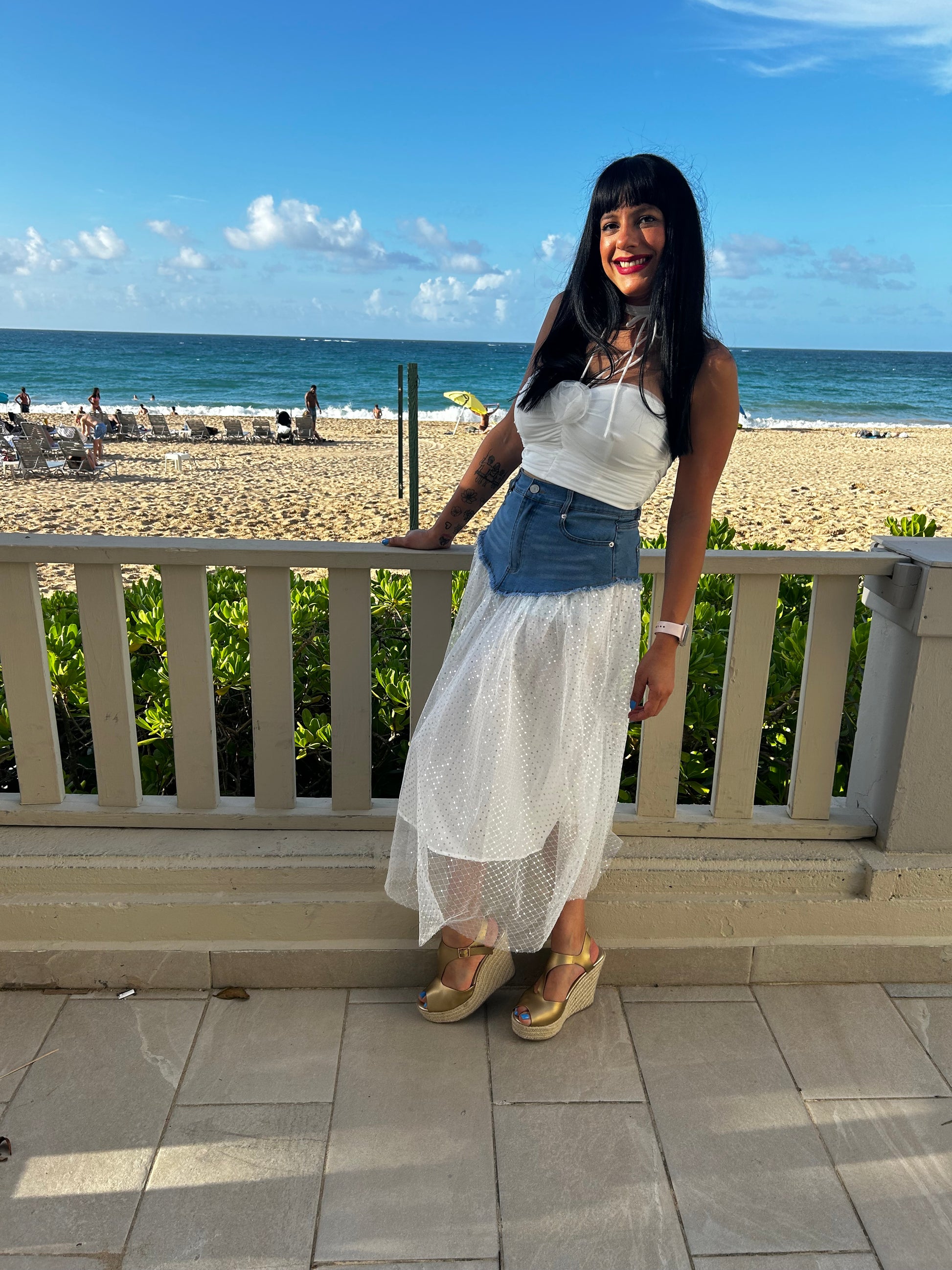 Usando talla: S / Medidas: 37” - 29” - 41” - Estatura: 5’ 6”